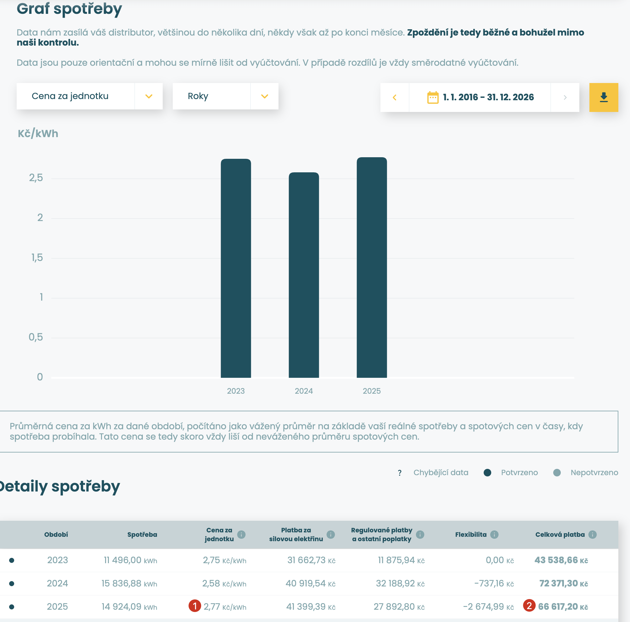 Já jen za sebe doplním, že k průměrné ceně nákupu “se vším všudy” 2.94 Kč/kWh jsem došel tak, že jsem sečetl platby ze všech 12 vyúčtování za odběr, odečetl platby co jsou per měsíc a ne per kWh (stálý plat + měsíční plat za rez. příkon + cena za provoz nesíťové infrastruktury, celkem 500 měsíčně), a vydělil počtem odebraných kWh. (Vidím, že v těch vyúčtováních za odběr je zahrnuto i “Zvýhodnění ceny v rámci aktivace doplňkové služby exibility”).