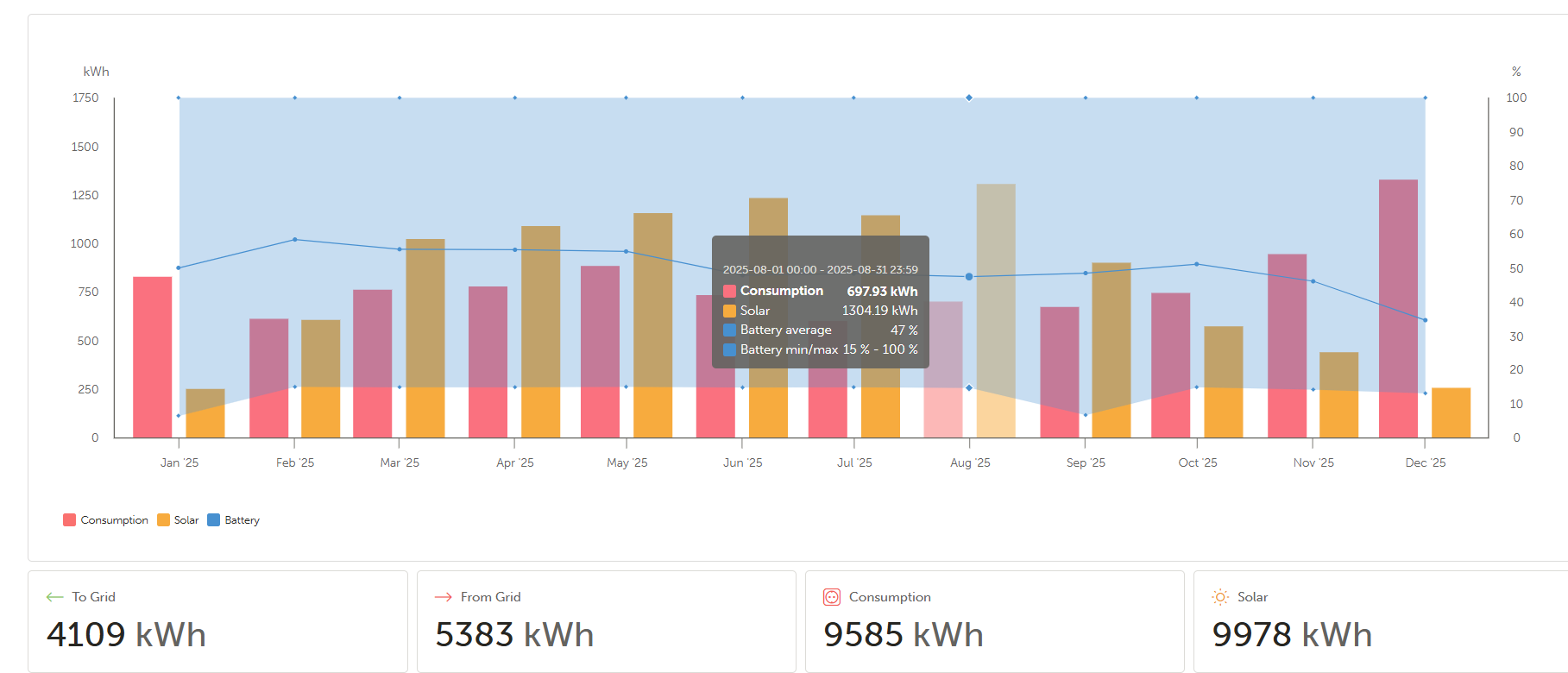 spotřeba ….bohužel systém ani já neumíme rozdělit z baterie …. kWh, ze sítě …. kWh)
