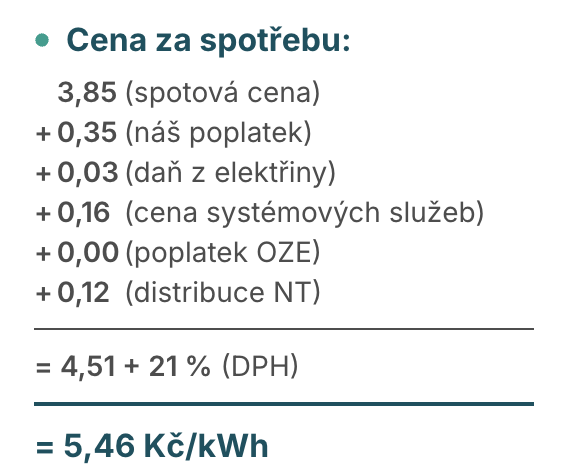 spotřební cena (silovka): 2.77 Kč/kWh včetně DPH (tedy spot, DG poplatek a DPH)