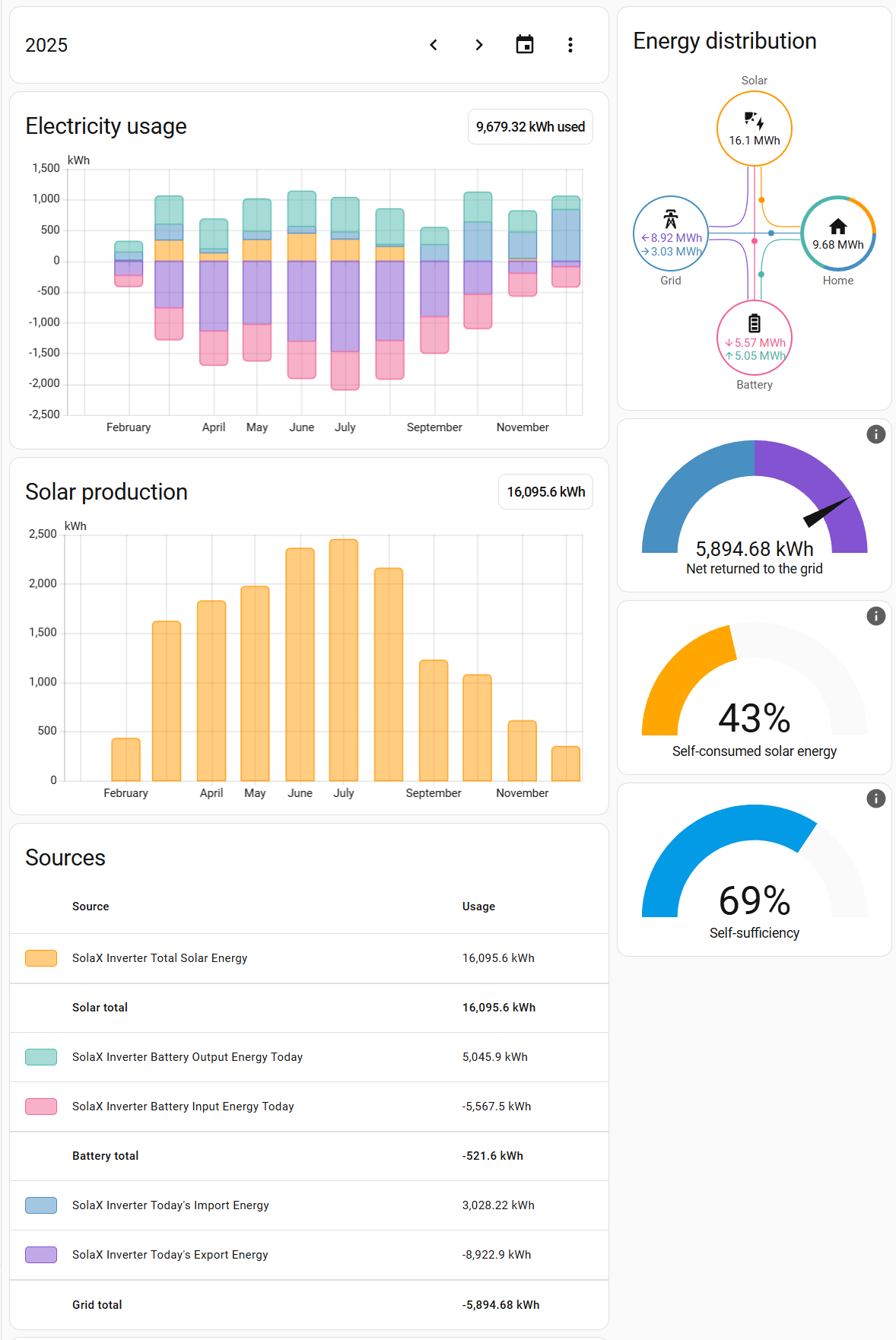 Solax neumí „rozbít“ spotřebu ani výrobu - jestli je ze sítě nebo z panelů - takže tento split nemám, ale Proteus by to asi dokázal posčítat