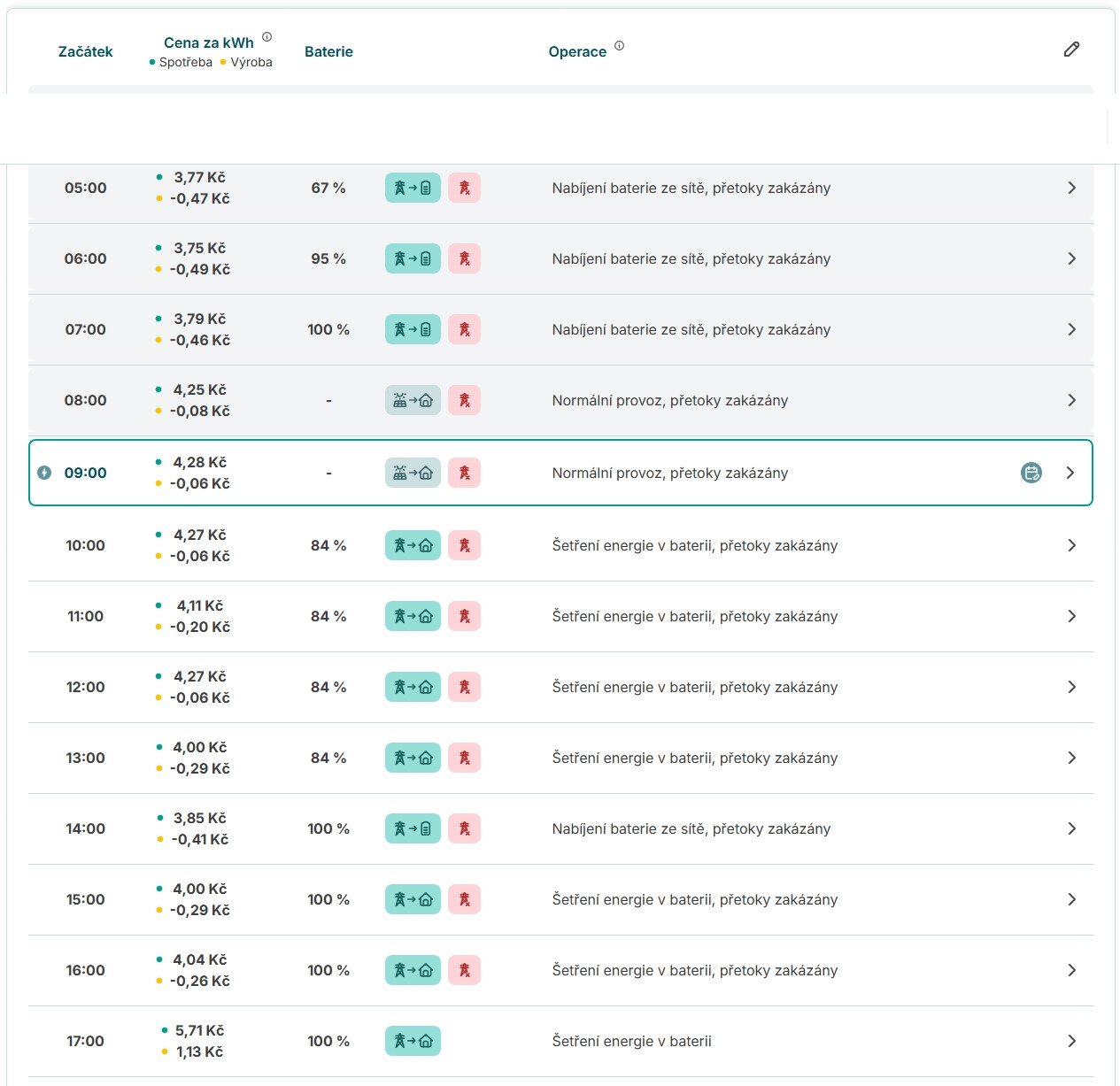 Už se na to bohužel nepodívám, protože jako uživatel tyto údaje už nikde v historii nevidím. Ten přiložený obrázek už je také po úpravě režimu na ty ranní hodiny na normální provoz. Když jsem se na to hned ráno po probuzení díval, tak baterie byla nabita z gridu na 100% a na celý den bylo naplánováno šetření energie v baterii. Přitom už začínalo ráno trochu svítit slunce (i podle predikcí měly být nějaké menší zisky) a pokud by se potom ráno nespouštěla flexibilita, tak by panely vypnul, protože přetoky díky záporným cenám byly zakázány. Ráno žádnou větší spotřebu nemívám, takže by ani neměly být v predikcích. Jedinou větší spotřeby pak mívám kolem 11-13h, kdy se spouští většinou ohřev TUV. To by ale také nedávalo smysl, proč by měl nabíjet ráno na 100 %.