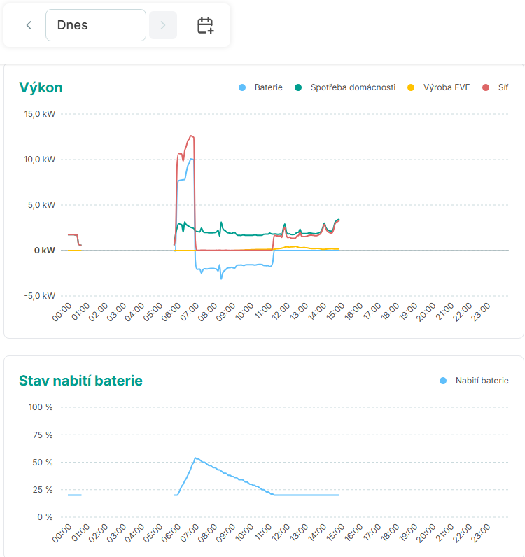- Když jsem ráno přepnul internet na záložní připojení, tak hned jak se Proteus chytil, tak jsem změnil operaci na nabíjení ze sítě (cca v 5:52 - pro aktuální i další hodinu), ale nabíjení nezačalo hned, ale až v následující celou hodinu (6:00). Chtěl jsem využít levnějšího okna na nabití a hlídal jsem, kdy začne nabíjení.
