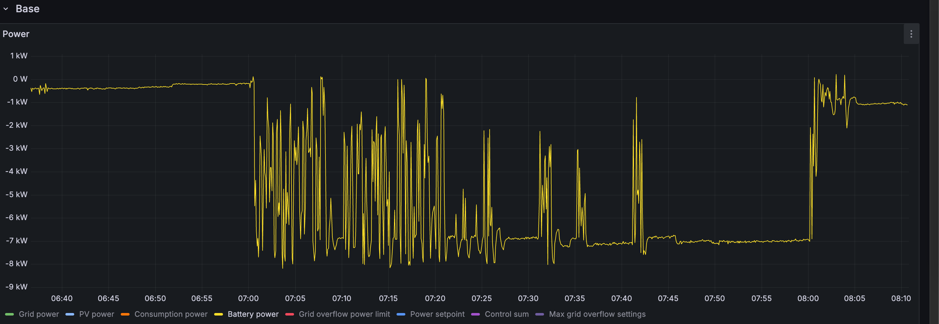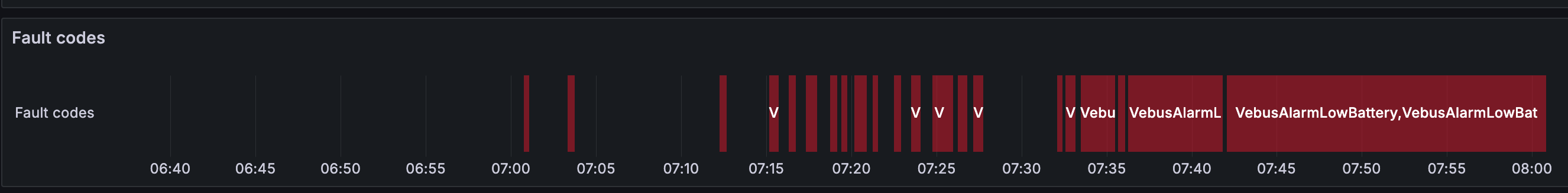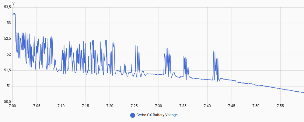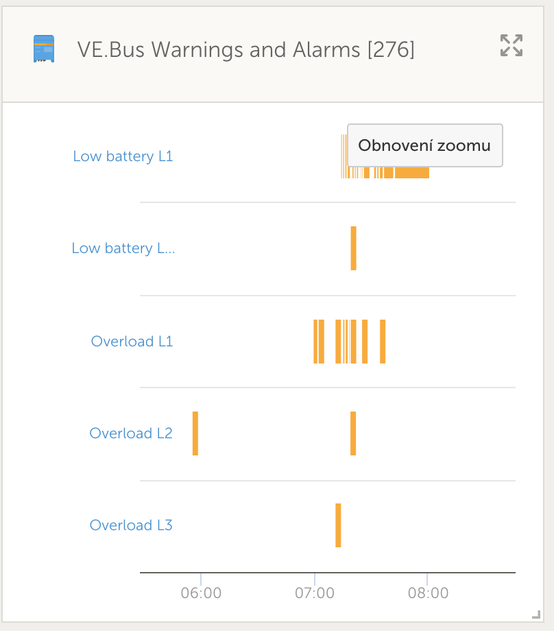 Co se týká těch chybových hlášek, sám nevím, jak k nim mohlo dojít, baterie za celou dobu mezi 7 - 8 neklesla pod 50,6 V, což je hranice kdy se spouští voltage pre-alarm. A výkon vybíjení 7kW rozdělen na 3x Multiplus 3000 by taky neměl způsobovat overload.