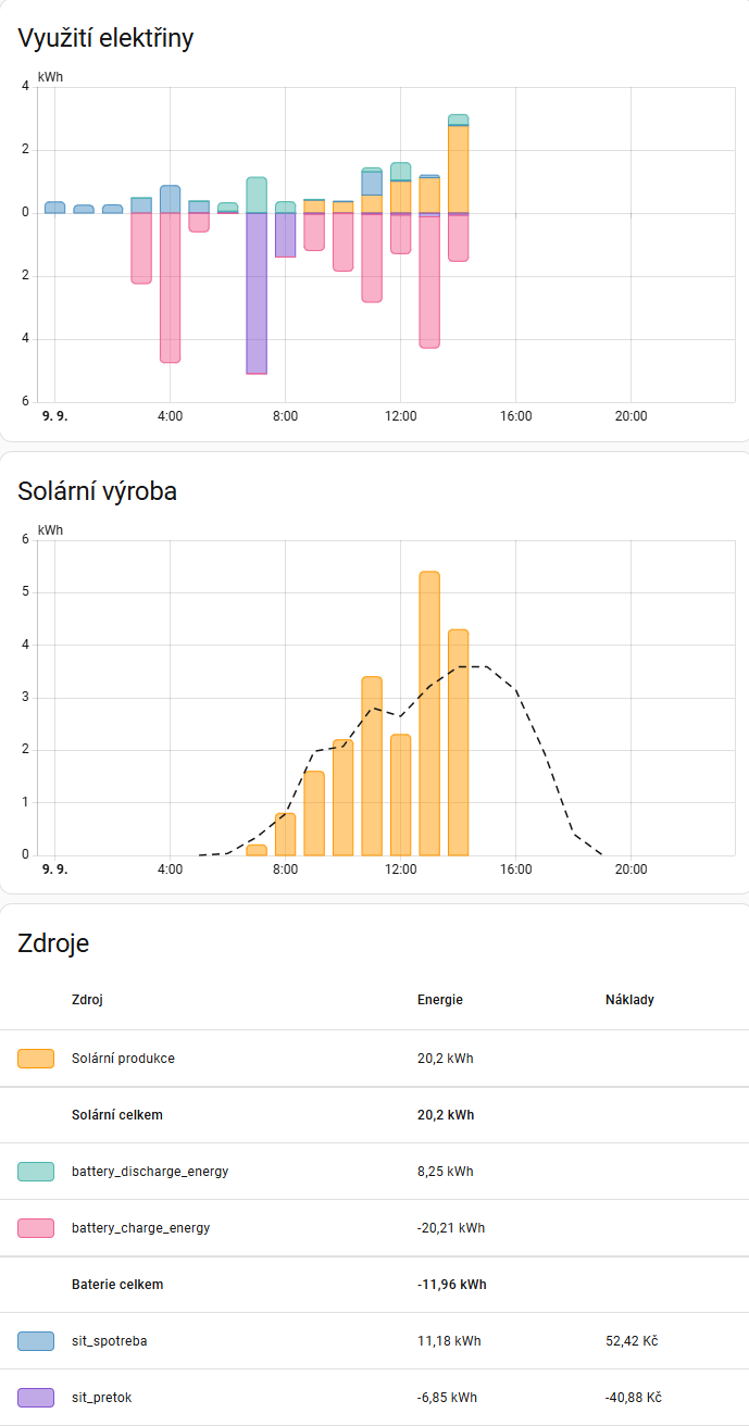 Nevím, jestli na celkový výsledek mělo vliv kolísání výkonu, bral jsem to tak, že z 20% baterie se dobila do 65% a pak zase vybila na 20%, takže celková energie je stejná (mínus ztráty), ale finančně mi to nevychází.