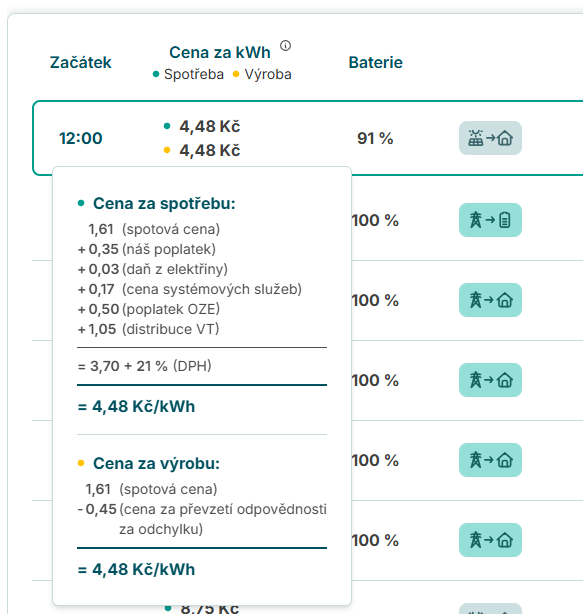 Dále by mě zajímalo, proč je na 13 hodin naplánováno dobíjení baterie ze sítě za 4,35, když mám baterii na 74% a dle predikce výroby se v pohodě ze slunce dobije, tak proč dobíjet za drahou cenu ze sítě.