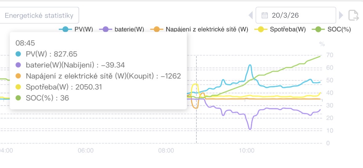 Myslím si, že nemáte pravdu. Pokud se baterie vybije na moje minimum, což je 15%, tak jakýkoli odběr, půjde ze sítě. DG zná naše chování a dokonce i ví a predikuje, že spotřeba v domě bude, ale přesto veškerou energii poslal do sítě. Mě pak stojí nejvíce peněz právě to “docucávání”.