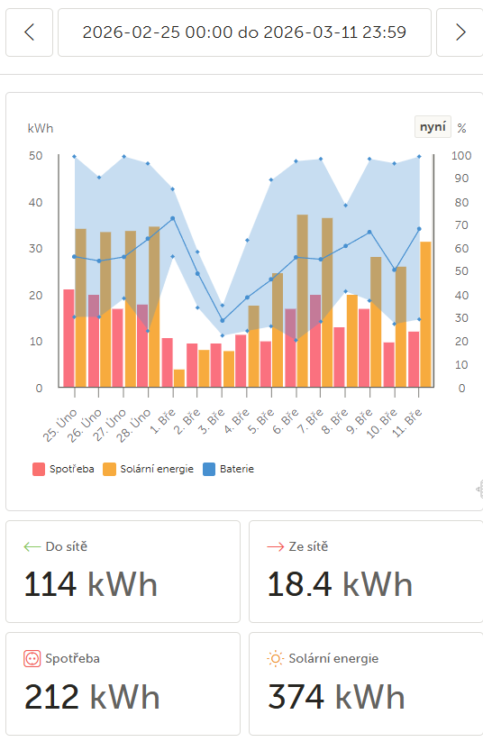 Já za posledních 15 dní odebral ze sítě celkem jen 18,4 kWh při spotřebě domu 212 kWh.