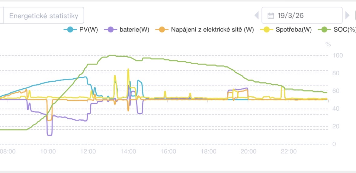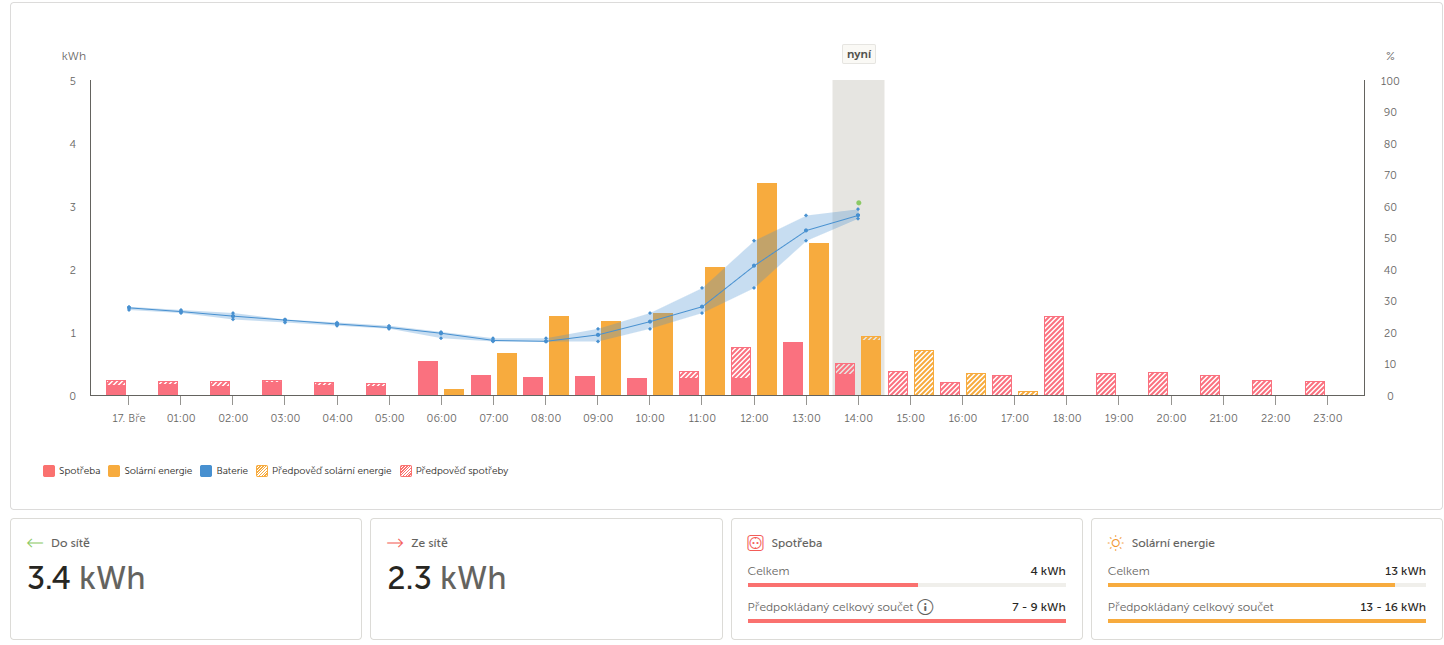 Dle vašich křivek výkonu, máte už teď v 13:00 h plnou baterii, je potřeba rozšířit a nebudete muset dokupovat ze sítě a platit “drahou” distribuci. S 28 kWh vydržíte 1,5 dne.