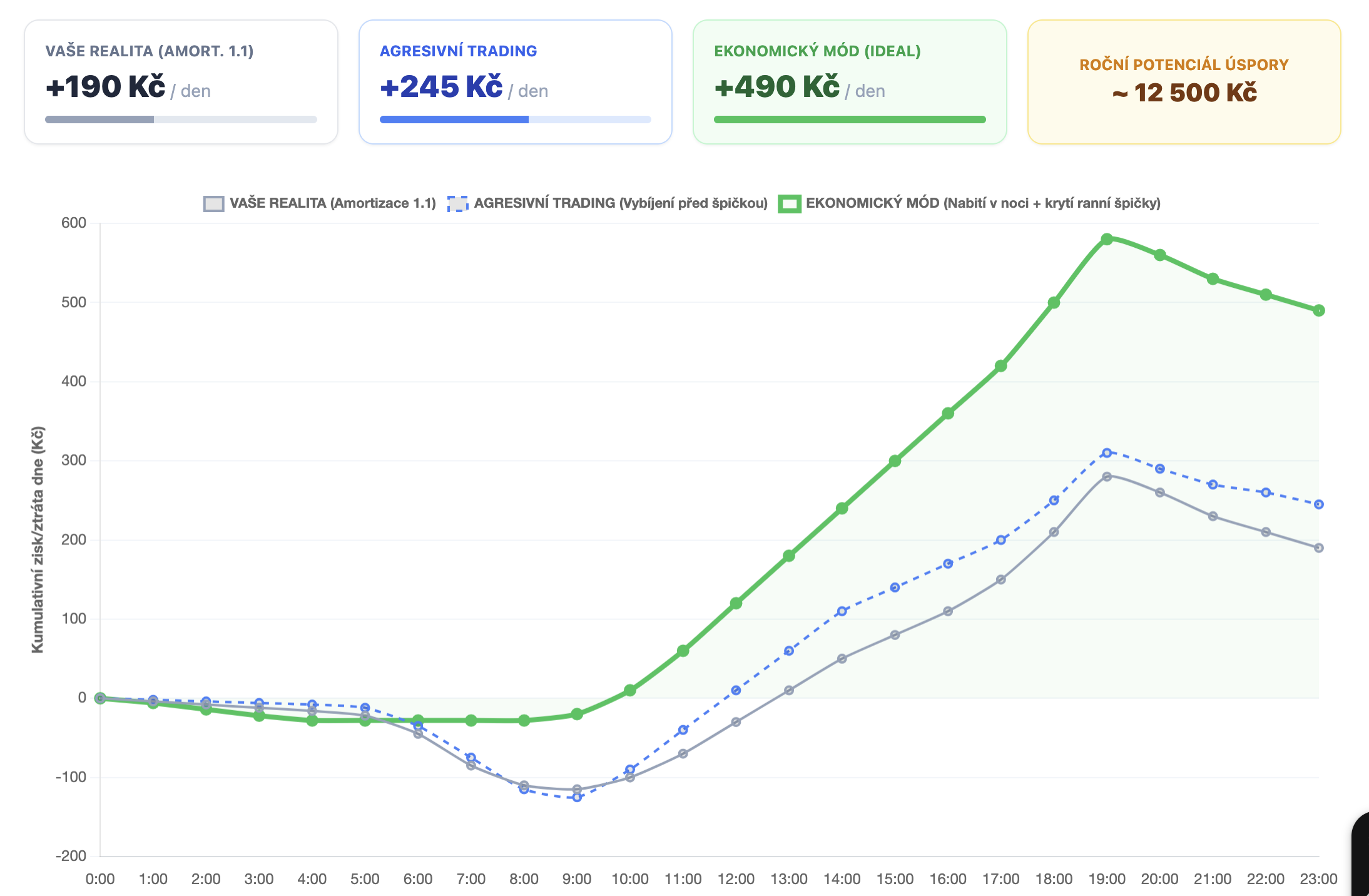 Kumulace zisku: Ideální zelená čára na konci dne končí nejvýše. To je ten „ekonomický mód“, který mi chybí. Nejde v něm o agresivní vybíjení, ale o maximální minimalizaci nákupu ze sítě. A pokud, tak za nejnižší ceny v dostupném období.