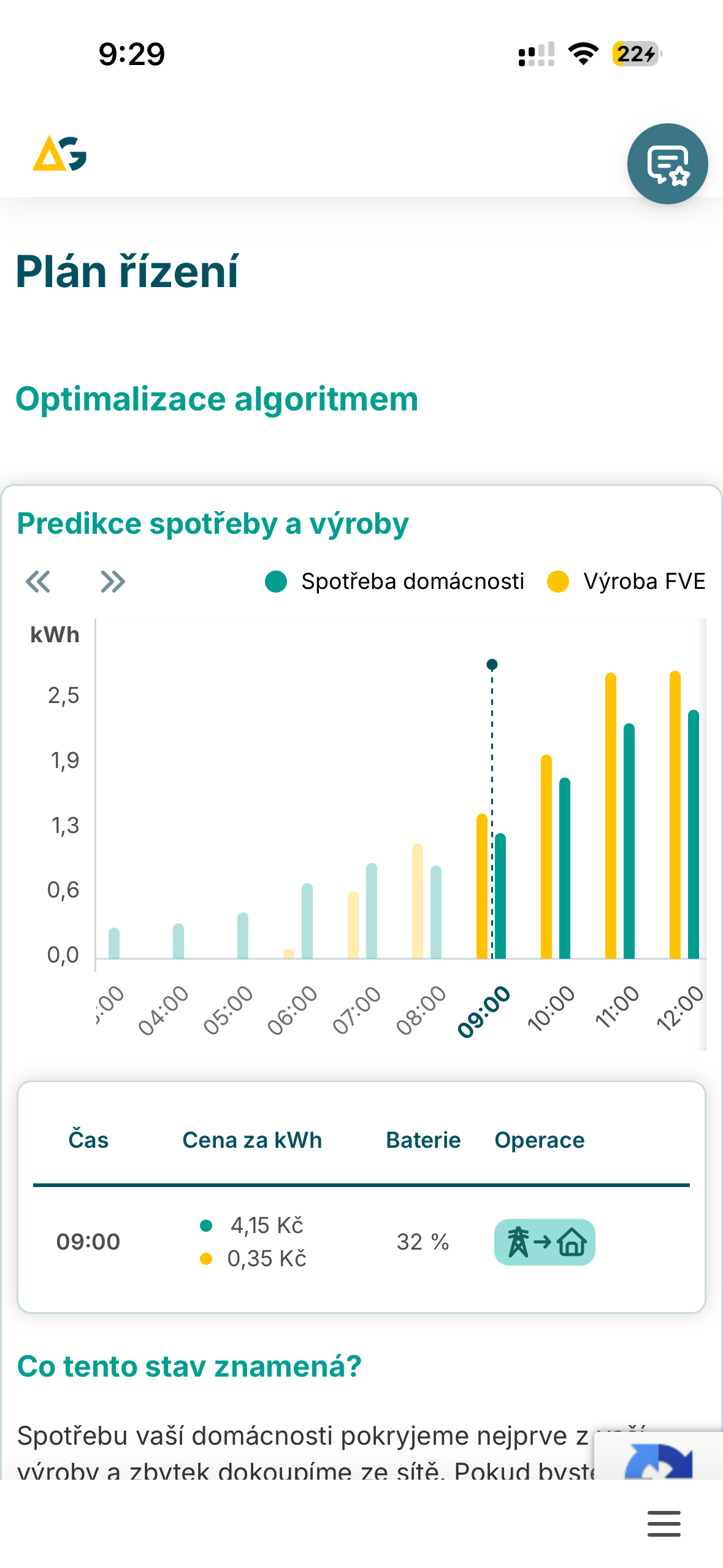následně od 7:00 do 9:00, kdy se podíváte do toho grafu, je vaše spotřeb cca 350W a výroba ze slunce cca 200W a postupně roste a v těch devět je cca 550W. Proteus to počítá ale jako energie, ne jako výkon každou vteřinu. Když si vezme predikce výroby (celková energie) a predikce spotřeby (celková energie) tak mu to vyšlo - pro mě až překvapivě - dobře. Bohužel ale realita je, že ten výkon se mění v čase a na začátku to ještě PV nepokrylo plně, až cca od 8:15 začala být PV výroba větší než spotřeba. I tak jste ale reálně odbral z gridu cca 400Wh za 7.06 Kč/kWh a tedy celkem za 2,82 Kč. Váš výsledek tedy je cca 13,58 Kč profit oproti tomu, kdyby to Proteus neřídil a neprodával v těch 06:00 - 07:00.
